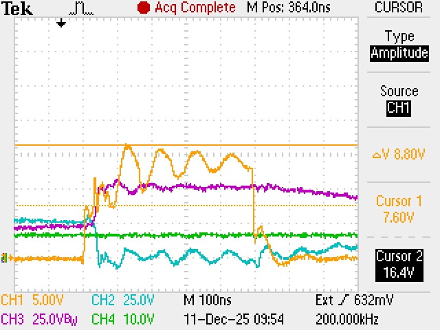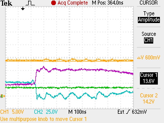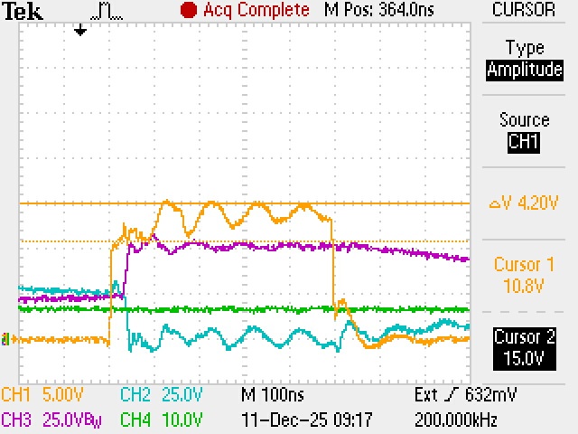We are using a Tektronix 6100 x10 voltage probe to measure the gate voltage, gate driver chip output and power supply pin (yellow) with a very short ground from the coaxial ring at the probe tip. We are using two Micsig DP10013 differential probes to measure the drain of the lower switch (blue) and the source of the upper switch (purple). The oscilloscope is a Tektronix TDS2014B.