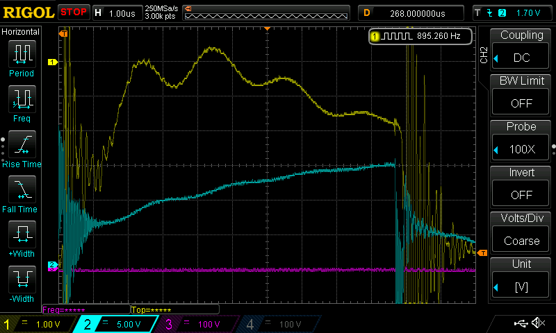 You mentioned in your answers to my previous post, that power loop inductance is a critical factor in system ringing. At these power levels I am not using a PCB, there are cables coming from the 900v capacitor bank, these run as a parallel pair as far as is practical but the capacitors are big and some inductance is unavoidable. I have a lot of capacitance across bus bars to the Power Mosfet pair, 100uF, a 50uf coupled as closely as possible with a further 2uF directly across the MOSFET terminals. I have looked at voltage here and the overshoot at when the HS switches off is very minimal bump. I have a Rowgowski probe but I cannot physically put it around the HS drain connection because the metalwork bus bars are so closely coupled, I imagine the high frequency ringing is coming from the local capacitors rather then the bigger power loop.