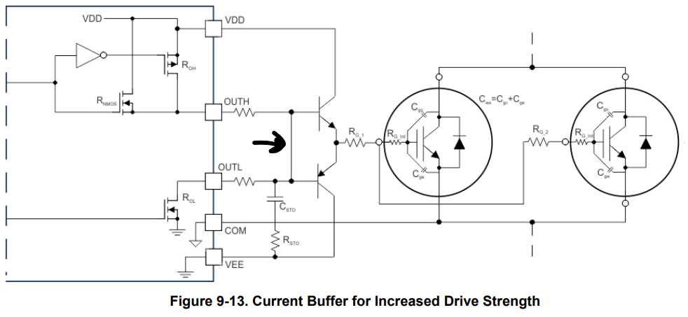 One thing that I noticed (see screenshot below) is that they are bridging the OUTH and OUTL pins of the driver, which I think would affect (slow down) the turn on speed because the STO RC circuit will slow down the rise time of the pin. The RC STO circuit should only slow down the turn off, if I understand correctly, so shouldn't the OUTH and OUTL pins be connected separately to the NPN and PNP transistors? Please let me know what you think and correct me if I am wrong.