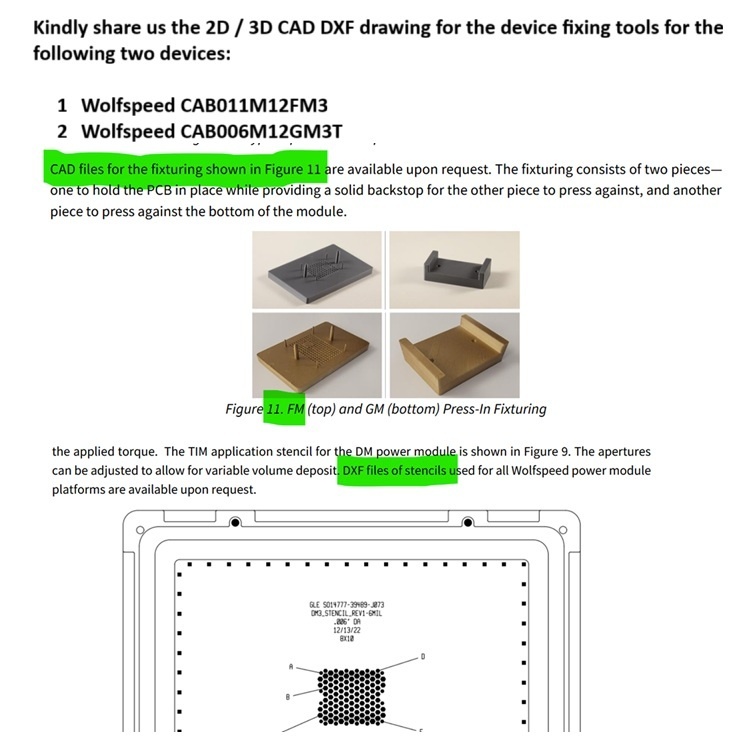 Hi, We GH Induction India pvt ltd located in Chennai. A joint venture of GH Spain. We are the OEM manufacturing induction heating machines. We use CAB011M12FM3 and CAB006M12GM3T in our PCB. To assemble the Sic module device we need fixture of top and bottom mould. Also