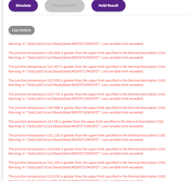 why the three phase inverter simulation with c3m0075120K is avaliable in 1000W but in 1500W, it show a error like this. it is thought that the current limit is not the case to over the device limit, it seem unresonable.