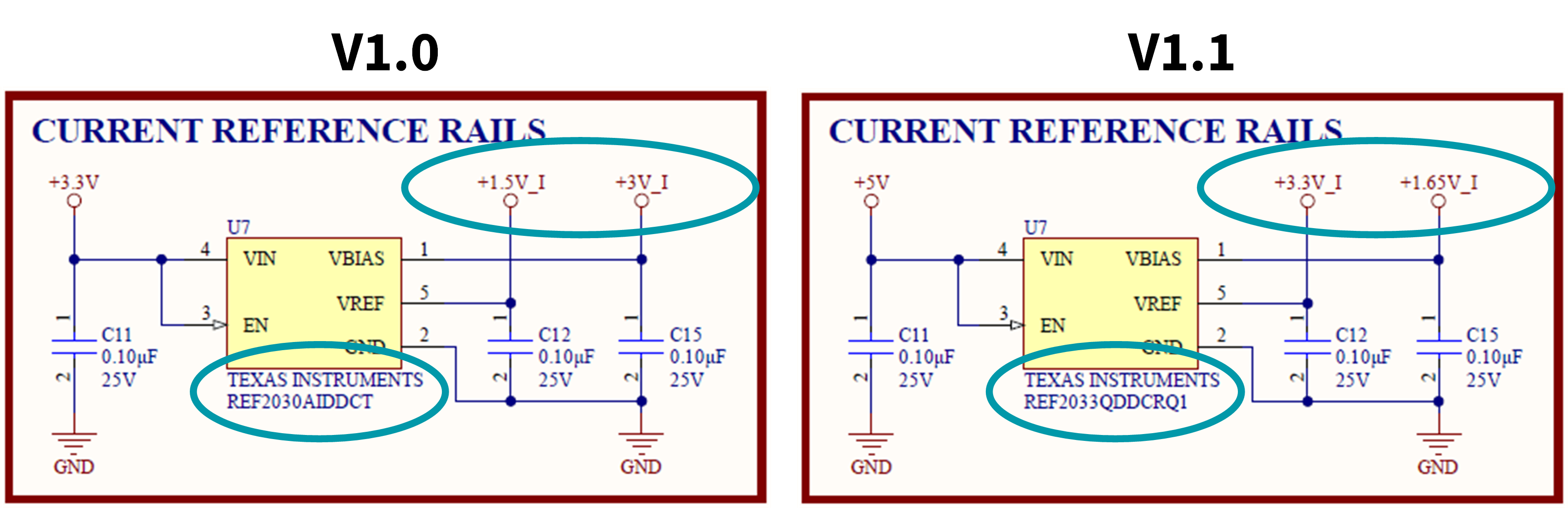 This is a known error in the V1.0 hardware that was quickly addressed in V1.1 and onward. The VBIAS and VREF pins were incorrectly flipped. VBIAS should be connected to the +1.5V_X rail and VREF should be connected to the +3V_X rail. I provided a picture below comparing the current reference rail connections in the V1.0 hardware vs the V1.1 hardware; the voltage rail connections are flipped. We also took the opportunity to change from +1.5V/+3.0V rails to +1.65V/+3.3V rails by switching from the Texas Instruments REF2030 to the Texas Instruments REF2033. This change enables the design to take advantage of the full 0V to 3.3V dynamic range of the the analog-to-digital converters (ADC) on the Texas Instruments TMDSCNCD280039C controller.