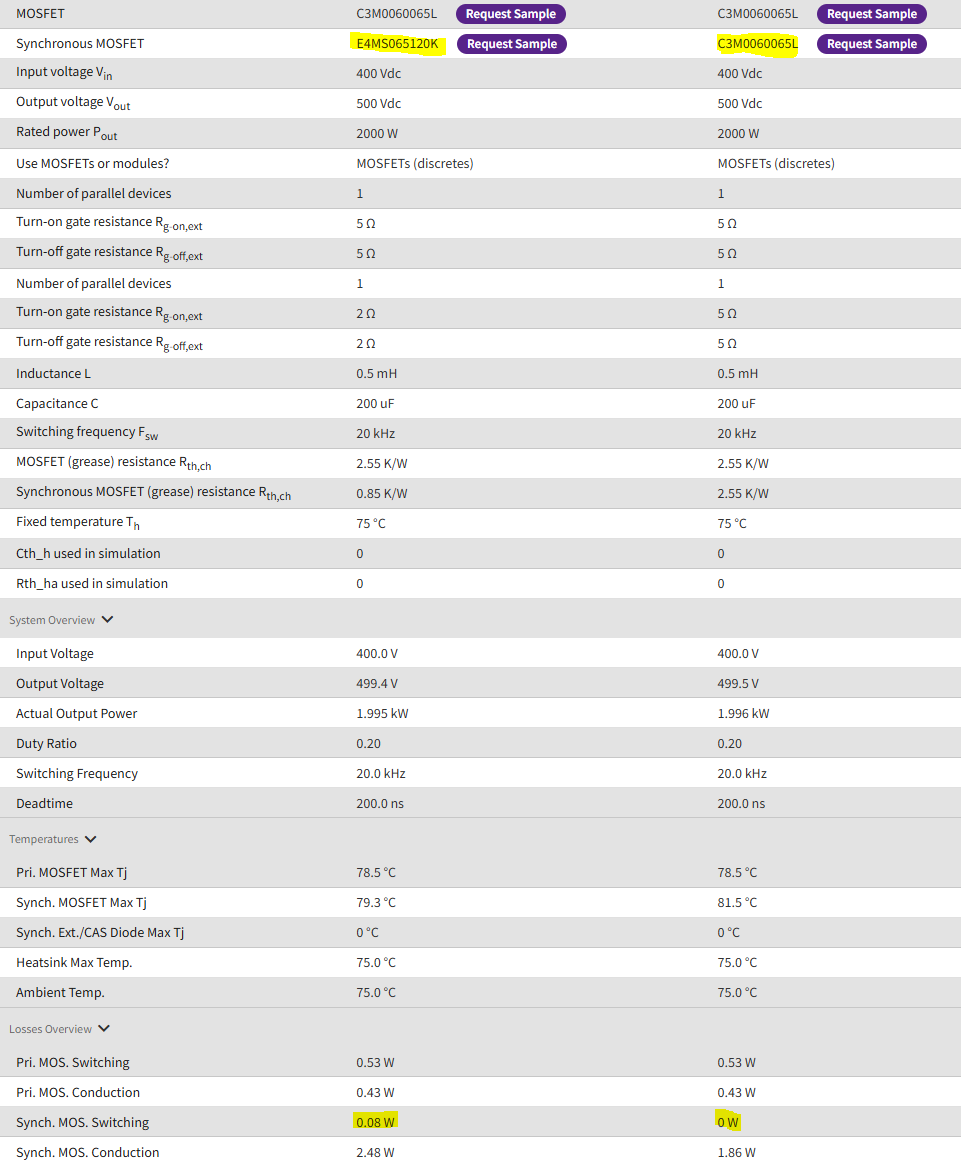 In the buck converter, the synchronous MOSFET only has reverse recovery losses (as it does not conduct in forward mode). Many of our older generation 3 discrete device models are missing reverse recovery losses, and so when used in the synchronous position, they will report 0 W switching losses. Here is a comparison of one of our newest devices to an old one: